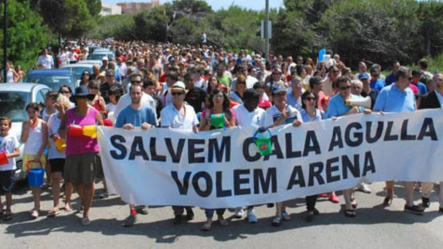 Pero el turismo, que lo engulle todo, necesitaba más espacio. Las aguas del mar arremetieron contra buena parte del arenal de la orilla, dejando al descubierto gran cantidad de rocas que, según el presidente de la Asociación Hotelera de aquel momento, impedían colocar las hamacas y sombrillas suficientes en la playa. “Debería haber tres veces más en número de estos elementos”, instigando una manifestación con “¡Salvem Cala Agulla, volem arena!”. No hubo vindicación alguna de los ecologistas; los empresarios querían mayor espacio para colocar más turistas, lo cual podía salvarles de una crisis.