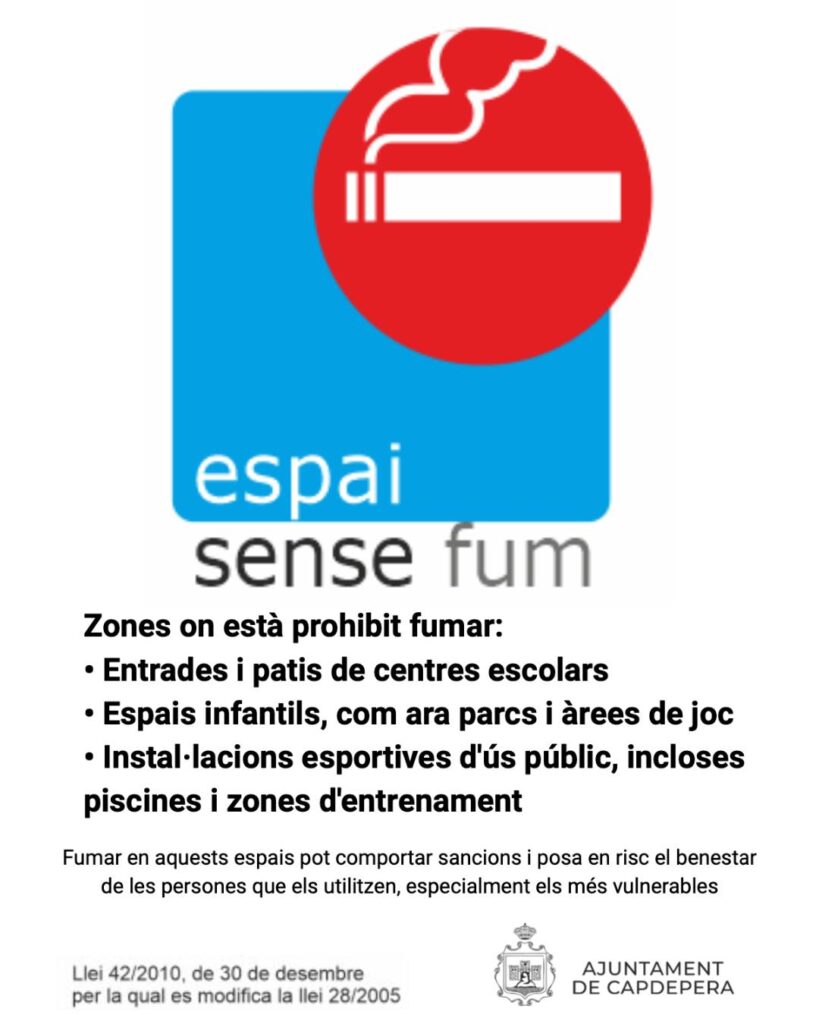 El consistorio ha instalado carteles de “espai sense fum” en diferentes puntos del municipio con el objetivo de informar y sensibilizar a la población. Se trata, de momento, de una acción pedagógica: la prioridad es recordar la normativa vigente y fomentar el respeto hacia el bienestar de todos los vecinos, especialmente de los más pequeños y de las personas más vulnerables.