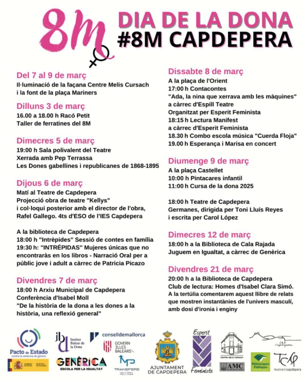 Uno de los actos más destacados tendrá lugar el sábado 8 de marzo, con una tarde de actividades en la plaça de l’Orient, donde se combinarán teatro, música y la lectura del manifiesto feminista a cargo de la asociación Esperit Feminista. La jornada finalizará con los conciertos de Esperança i Marisa y el combo de la Escola Municipal de Música de Capdepera, «Cuerda Floja».