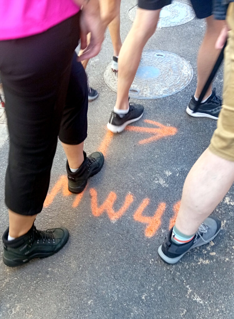 De acuerdo con la información recogida, la actividad tuvo carácter masivo y había sido previamente publicitada por la organización. Durante su desarrollo, los guías señalizaron el recorrido mediante pintadas en el asfalto, adhesivos colocados en mobiliario urbano y carteles fijados en diferentes elementos del entorno. En concreto, se han documentado 25 adhesivos, siete pintadas —tanto en el núcleo urbano como en caminos rústicos— y siete carteles sujetos con bridas a señales públicas y árboles.
