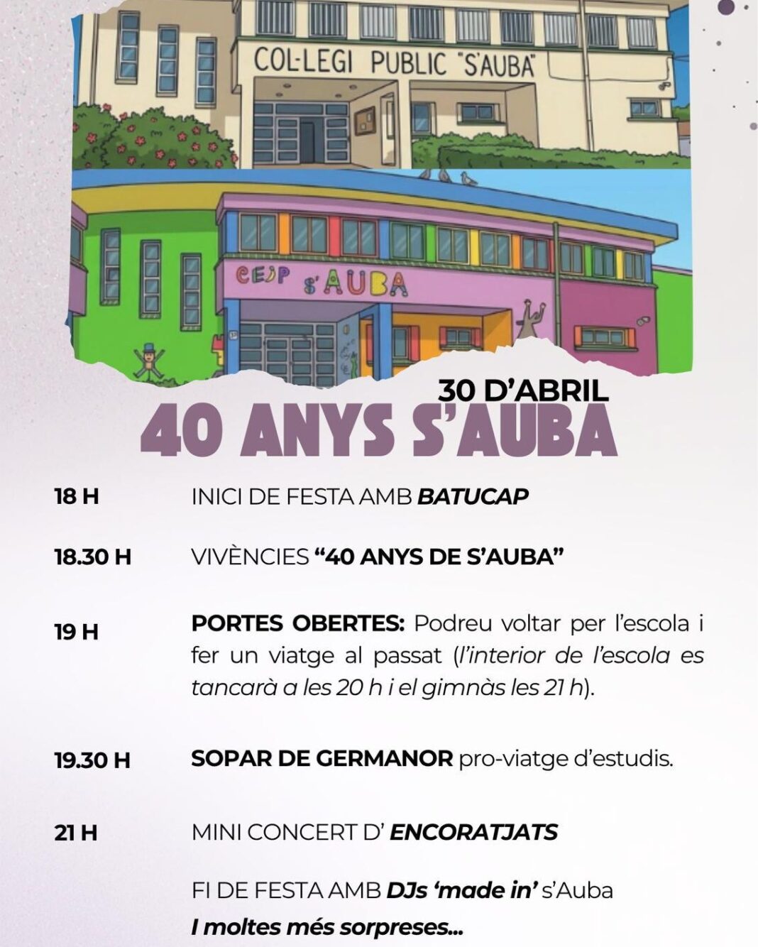 La velada concluirá con una sesión musical a cargo de DJs “made in s’Auba”, en una fiesta que promete reunir a distintas generaciones en torno a un centro educativo que ha marcado la vida de muchas familias del municipio.