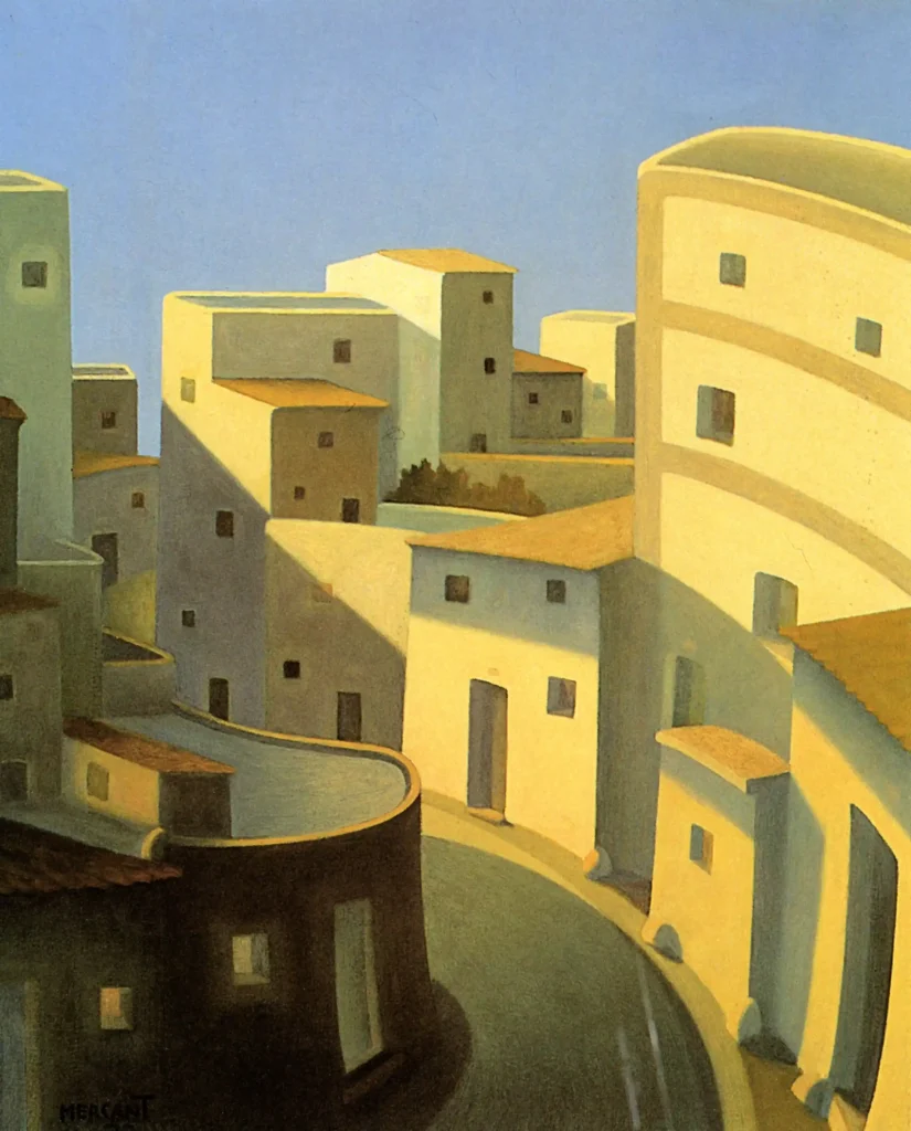 Como ya he dicho, los elementos de sus cuadros muestran lugares y motivos fácilmente identificables, pero Mercant rechaza la copia, de manera que su pintura se basa en el recuerdo de lo que ha visto y vivido, de la huella que le ha dejado y, a partir de aquí realiza a lápiz, bolígrafo o rotulador, sobre papel o cartón, una serie de esbozos, los cuales, dependiendo de la época, trasladará a tela, cartón madera o tablero para seguidamente, aplicar diversas capas o veladuras muy sutiles de pintura al óleo.. Mercant, en el taller, a partir de lo que ha captado en su memoria, reorganiza el espacio, idealiza los motivos, depura las formas añadiendo, suprimiendo o modificando los elementos compositivos en función de la idea o sentimiento que lo anima, todo ello mediante la utilización del color, la luz, el espacio y la atmósfera, convirtiendo así lo cotidiano en poético. No le interesa la «mímesis» sino la evocación, la sugestión. Su obra habla de emociones, de sentimientos y, mediante un lenguaje sugerente, representa un entorno mediatizado por la subjetividad. Sus paisajes son interpretaciones, recreaciones de aquello que ha observado; están a medio camino entre la realidad y su mundo interior, son un reflejo de él mismo, de su manera de estar en el mundo y percibir el entorno, expresan su yo más profundo, son en definitiva paisajes interiores. Las calles desiertas, los paisajes y lugares vacíos transmiten una atmósfera de placidez, de silencio, de serenidad, como si el tiempo se hubiera detenido, acentuado por la ausencia de presencia humana, exceptuando las escasa ocasiones en que aparece alguna referencia humana en la lejanía, como si fuera un elemento más del paisaje. El recurso de los contraluces, de las luces crepusculares del amanecer o del atardecer, acentúa y da soporte a su personal visión de la desolación y el vacío. Mercant profundiza en lo real, en sus límites, creando una realidad amplificada.