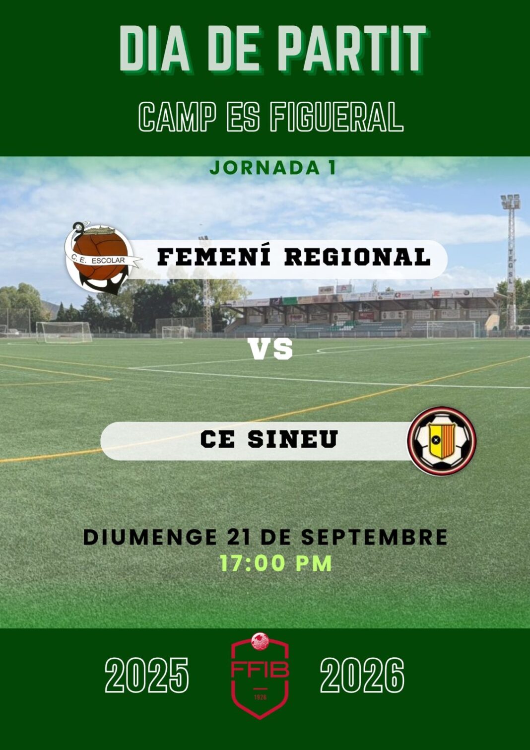 Un día después, el domingo 21 de septiembre, será el turno del Femení Regional, que debutará en casa, en el Camp Es Figueral, frente al CE Sineu. El partido está programado para las 17.00 horas y supondrá el estreno liguero de las jugadoras verdiblancas, que buscarán empezar con buen pie delante de su afición.
