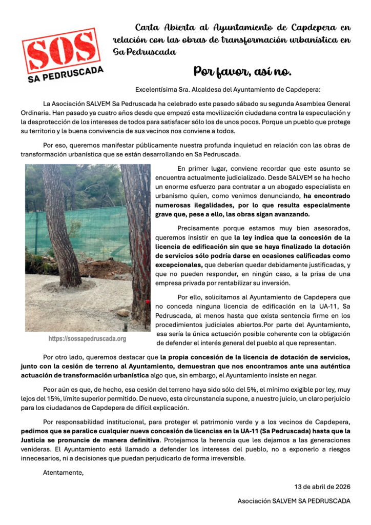 En realidad no se trata de una carta enviada al Ayuntamiento. Es una carta abierta para su publicación en medios. En ella explicamos que la reparcelación está judicializada, que un juzgado de Palma ha admitido la demanda a trámite y todas las pruebas que hemos solicitado, incluyendo documentación que debe aportar el propio Ayuntamiento. Será el juzgado quien analice todo y tome una decisión.