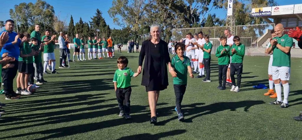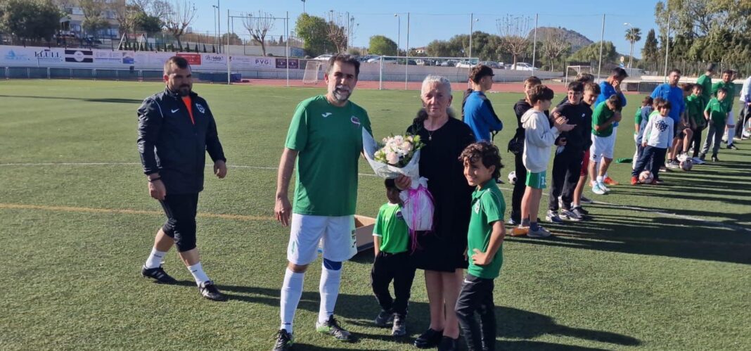 Chelo Escudero, madre de Nene, también recorrió el pasillo entre aplausos. En este caso, Mariano Ramón, segundo capitán del equipo de veteranos del CE Escolar, le hizo entrega de un ramo de flores.