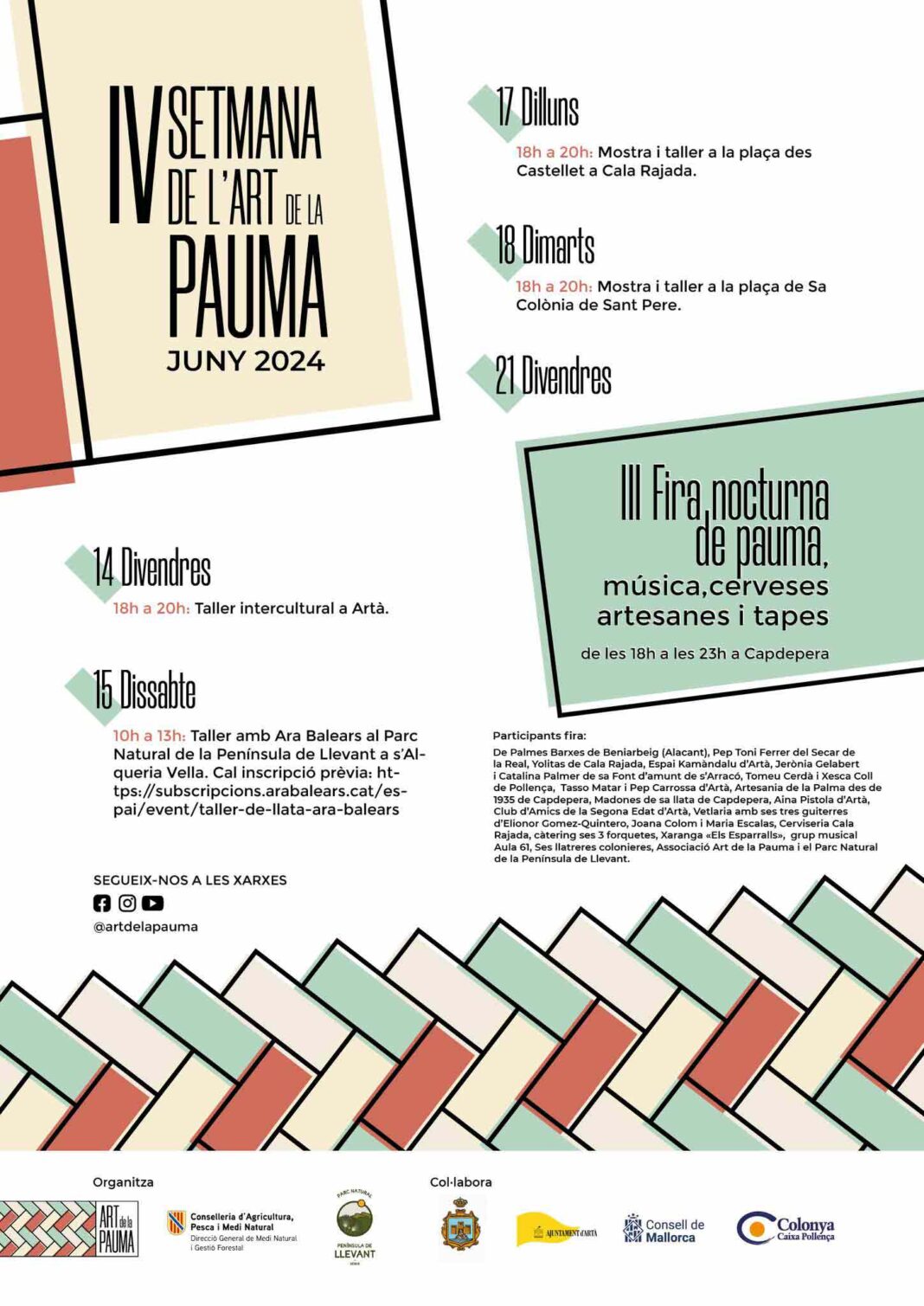 El sábado 15 de junio, de 10 a 13 horas, se llevará a cabo un taller en colaboración con Ara Balears en el Centro de s’Alqueria Vella, Artà. Para participar en este taller es necesaria una inscripción previa, debido al limitado número de plazas. Este taller es ideal para aquellos interesados en profundizar en las técnicas de la pauma y su aplicación práctica.