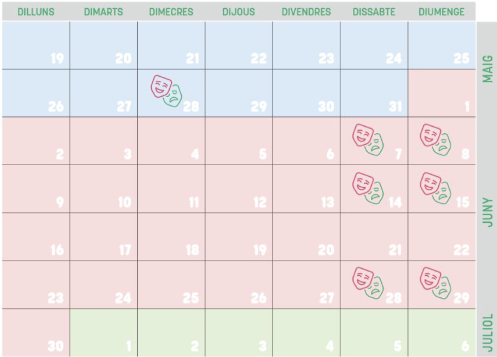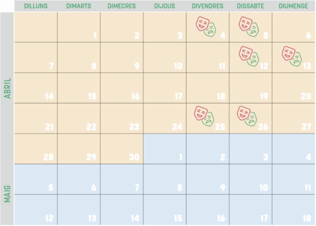Durante el mes de mayo, al menos hasta día 28, no se celebrarán representaciones, ya que el calendario cultural del municipio se centra en los actos conmemorativos del Mercat Medieval. La actividad escénica se retomará como decimos el día 28 de mayo con una nueva propuesta matinal a cargo de la Escola Municipal de Música de Capdepera y el CEIP s’Alzinar, con el montaje Tres Pistons i Descordats, que promete ser otra muestra del cruce entre disciplinas y generaciones que define la muestra.