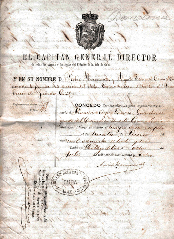 El director de la Capitanía General en la isla de Cuba, en representación del Teniente Coronel de los Tercios de la Guardia Civil, Fabio Hernández Delgado, expidió a Juan Francisco la licencia absoluta para poder cesar en el servicio y habiendo cumplido el tiempo reglamentario el 30 de junio de 1878.