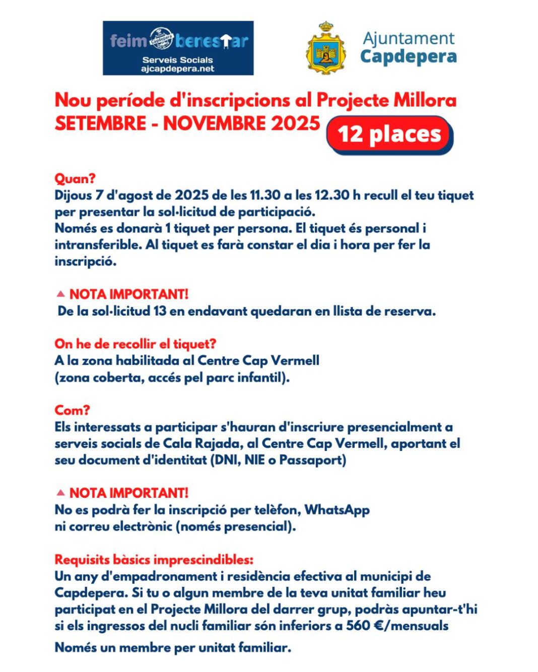Entre los requisitos imprescindibles se establece tener al menos un año de empadronamiento y residencia efectiva en el municipio de Capdepera, y que solo podrá participar un miembro por unidad familiar. En el caso de haber participado ya en el grupo anterior del Projecte Millora, solo será posible volver a optar si los ingresos del núcleo familiar son inferiores a 560 euros mensuales.