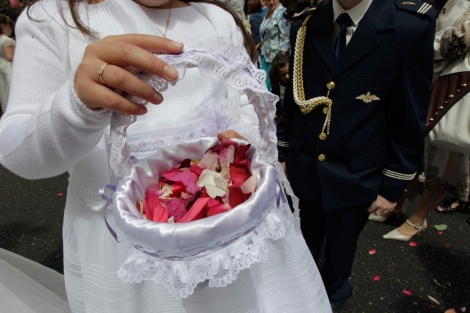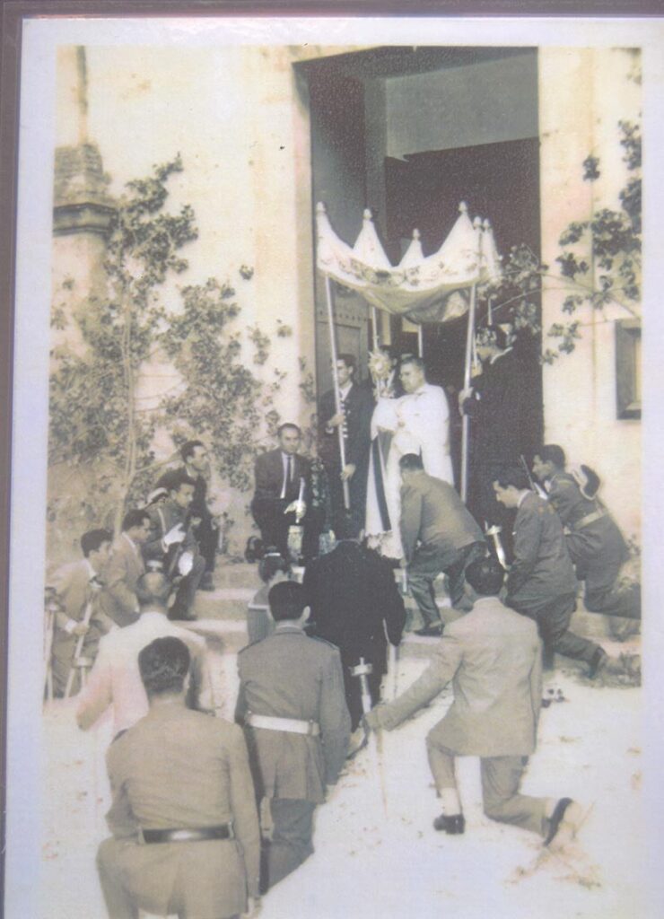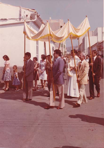 Entre angelets, banderes, pendons, tabernacles i altres figures al·lusives a tan solemne festivitat, desfilaven, vestits de blanc, els nins i nines que havien fet feia poc la primera comunió, les dones amb vel posat i rosari en mà, dues llargues fileres d’homes ben enllestits, amb la millor mudada i portant un ciri encès. Mentrestant, els més menuts tiraven flors al Santíssim Sagrament, com àngels baixats del cel. La banda de música escampava els seus sons amb peces, sovint en castellà, com era el precepte de l’època, com ara: “Cantemos al amor de los amores, Cristo en todas las almas y en el mundo la paz”, tot alternant amb el “Pange Lingua”.