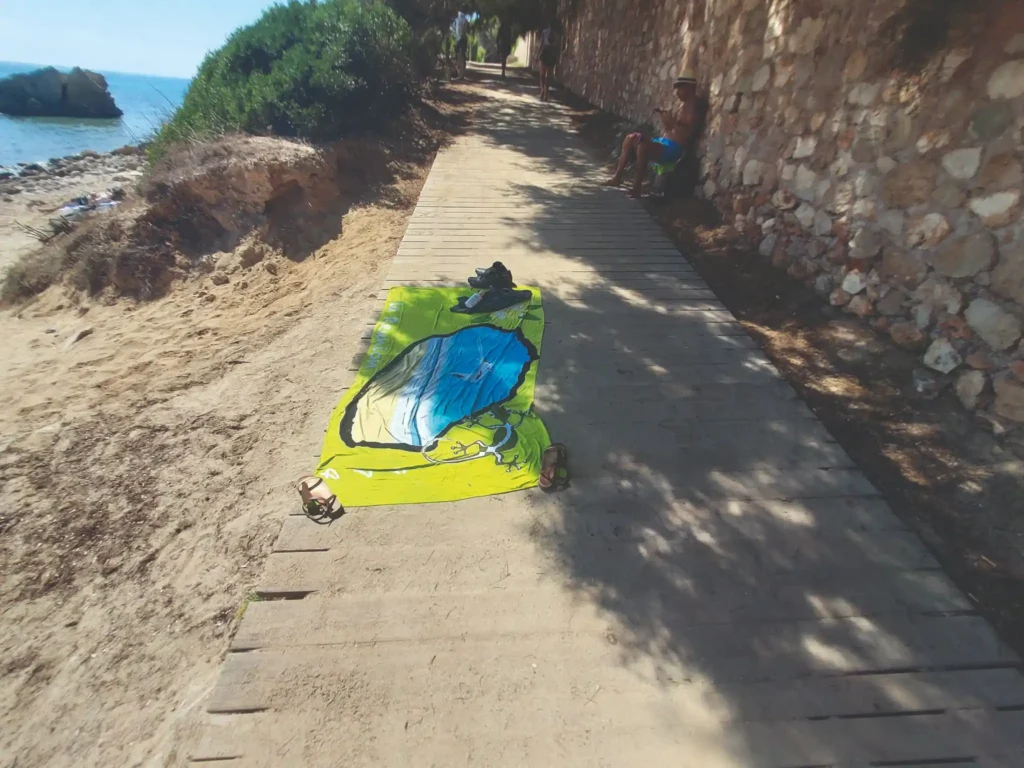 Basta ver una de las imágenes que ha pillado el bueno de Colau, que deja entrever que hay gente que por falta de espacio, o porque busca una sombra gratuita (que todo ha de ser dicho) se monta un ‘chiringuito’ en plena pasarela peatonal.