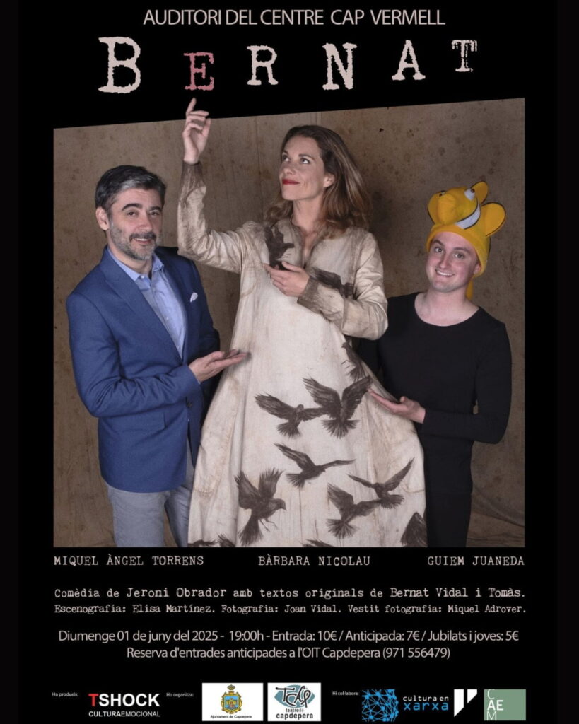 Este domingo 1 de junio, a las 19.00 horas, el Auditori del Centre Cap Vermell se viste de comedia para acoger BERNAT, una pieza escrita por Jeroni Obrador a partir de textos originales de Bernat Vidal i Tomàs, uno de los referentes de la poesía mallorquina del siglo XX. Lejos de lo que su origen literario pudiera hacer pensar, la obra no es un recital de solemnidades, sino una comedia de enredos tan irónica como entrañable que hace del universo poético su campo de juego.