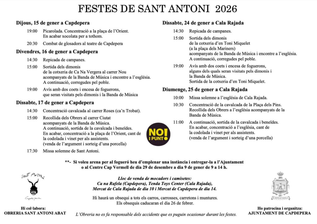 El domingo, 25 de enero, Cala Rajada vivirá la parte más solemne y festiva. A las diez de la mañana se celebrará la misa solemne en la iglesia, seguida a las diez y media por la concentración de la cavalcada en la plaza dels Pins y la recogida de los Obrers. A las once, la salida de la cavalcada y las beneïdes darán paso, al finalizar, a la concentración frente a la iglesia, con el canto de la codolada y un vino para los asistentes venda de l’argument i sorteig d’una porcella).