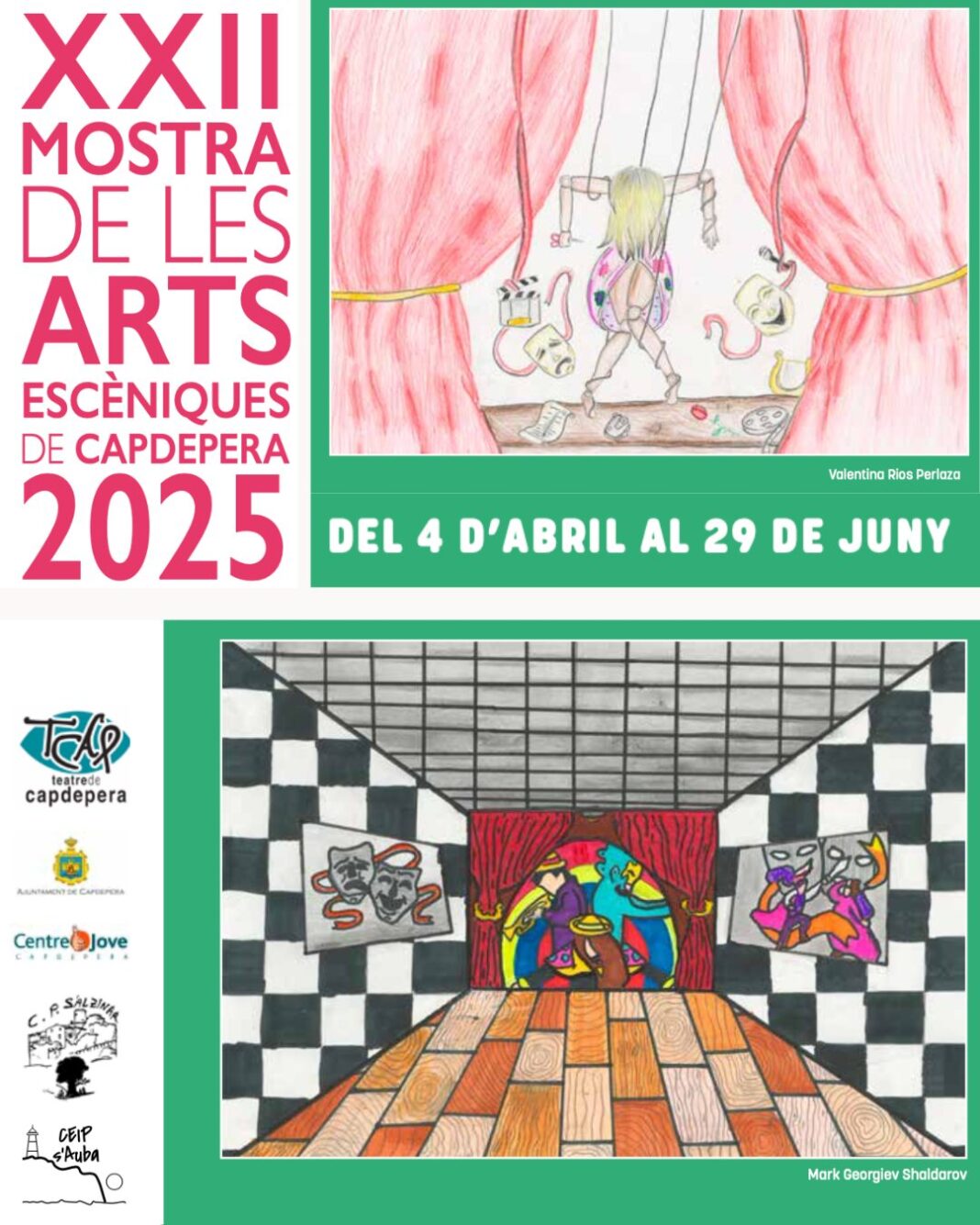 Además del componente artístico, la Mostra es una herramienta educativa de primer nivel. Los alumnos no solo actúan, sino que participan en la creación colectiva de las obras, en la escenografía, en la música y en la transmisión de valores. Este enfoque participativo se refuerza con el tradicional concurso de carteles, del que han salido las ilustraciones oficiales de esta edición. Valentina Ríos Perlaza y Mark Georgiev Shaldarov han sido los ganadores principales, acompañados por una larga lista de finalistas de los centros CEIP s’Alzinar y CEIP s’Auba, cuyos trabajos dan color y vida al material gráfico del evento.