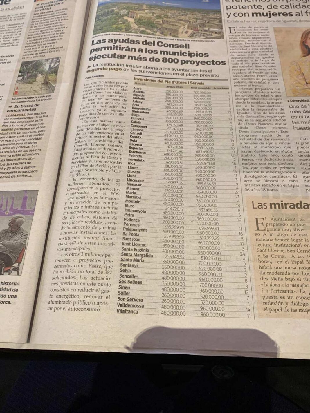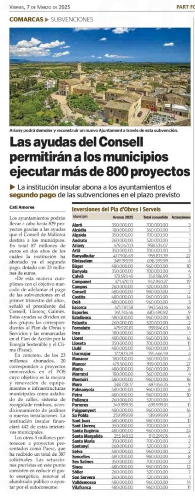 El Consell de Mallorca ha anunciado la concesión de subvenciones para que los municipios de la isla puedan ejecutar más de 800 proyectos, con inversiones millonarias en infraestructuras y mejoras urbanas. Sin embargo, en la lista publicada… Capdepera brilla por su ausencia (foto de la noticia publicada por Última Hora).